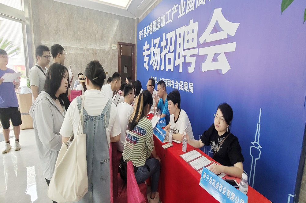 为保障园区企业引才需求,促进高校毕业生就业,7月10日,周宁县人力资源和社会保障局在壹号娱乐-com钢管有限公司福建分公司举办了“周宁不锈钢深加工产业园高校毕业生专场招聘会”,为高校毕业生与企业搭建双向交流平台。壹号娱乐-com钢管、盟信公司等多家园区企业参加招聘会,提供多个优质就业岗位。