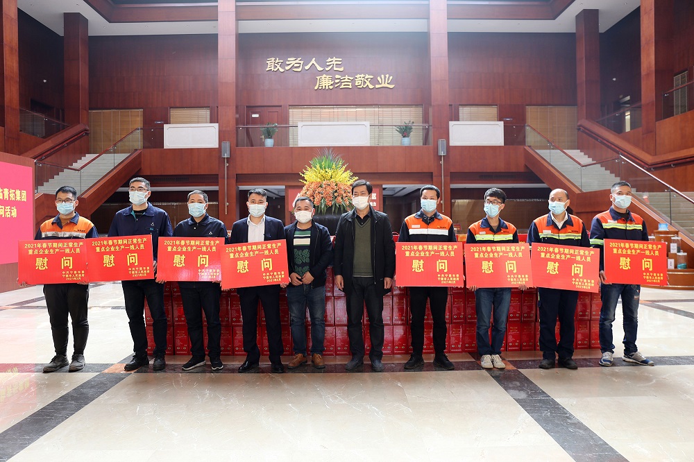 在青拓集团供销大厅,宁德市工信局二级调研员缪明华、福安市工信局副局长王辉带领工信局人员向青拓实业股份、青拓镍业、青拓科技、青拓实业、青拓设备等公司发放慰问品。在欢乐祥和的气氛中,190份慰问礼包和9050张旅游套票分发至各公司代表手中,青拓镍业董事长何积秀、青拓科技总经理王晋等领导代表各公司接受慰问礼品。