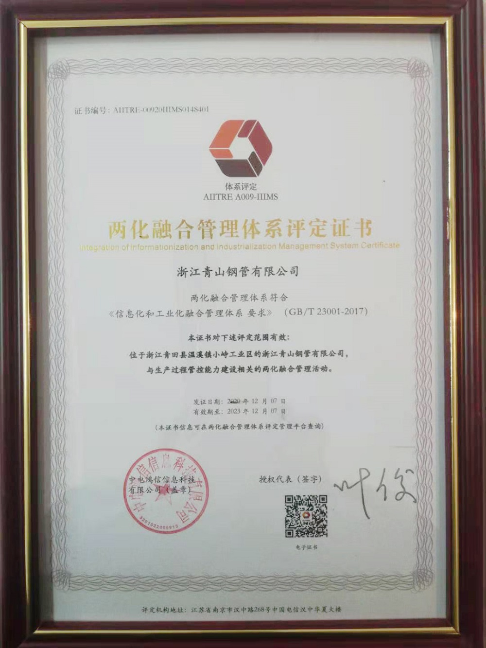 12月份,浙江壹号娱乐-com钢管有限公司顺利通过国家工业和信息化部《信息化和工业化融合管理体系要求》(GB/T 23001-2017)体系认证,获得两化融合管理体系评定证书。