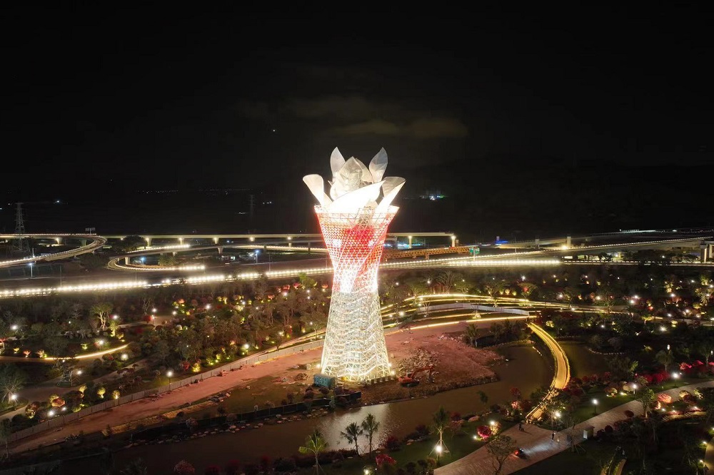 三角梅迎宾塔位于三亚市崖州区三角梅科博园中央位置,以科学种子为原型,可动态展示“种子”“姹紫嫣红”“稻田麦浪”“火炬”“蛟龙入海”五种映像,是幸福和希望的象征,展示了不锈钢加工塑性的曲线美,成为传达地区文化、面向世界的窗口和符号。